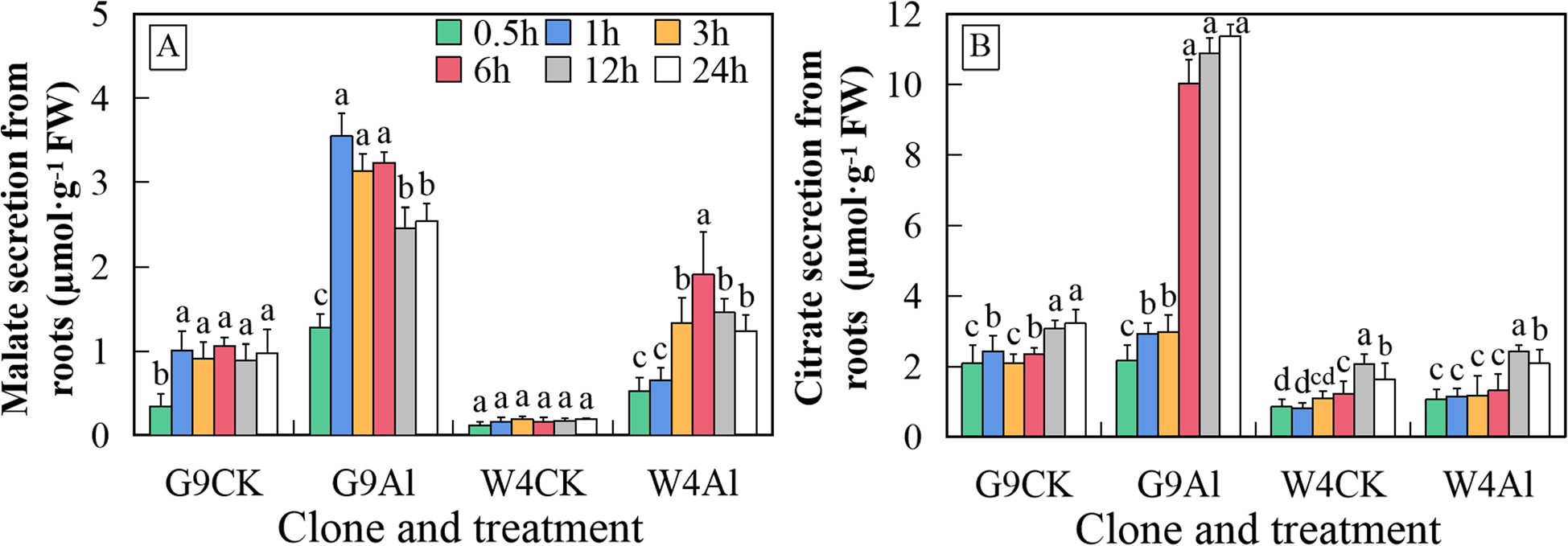 图2铝处理下G9和G4根系苹果酸(A)和柠檬酸分泌(B)量