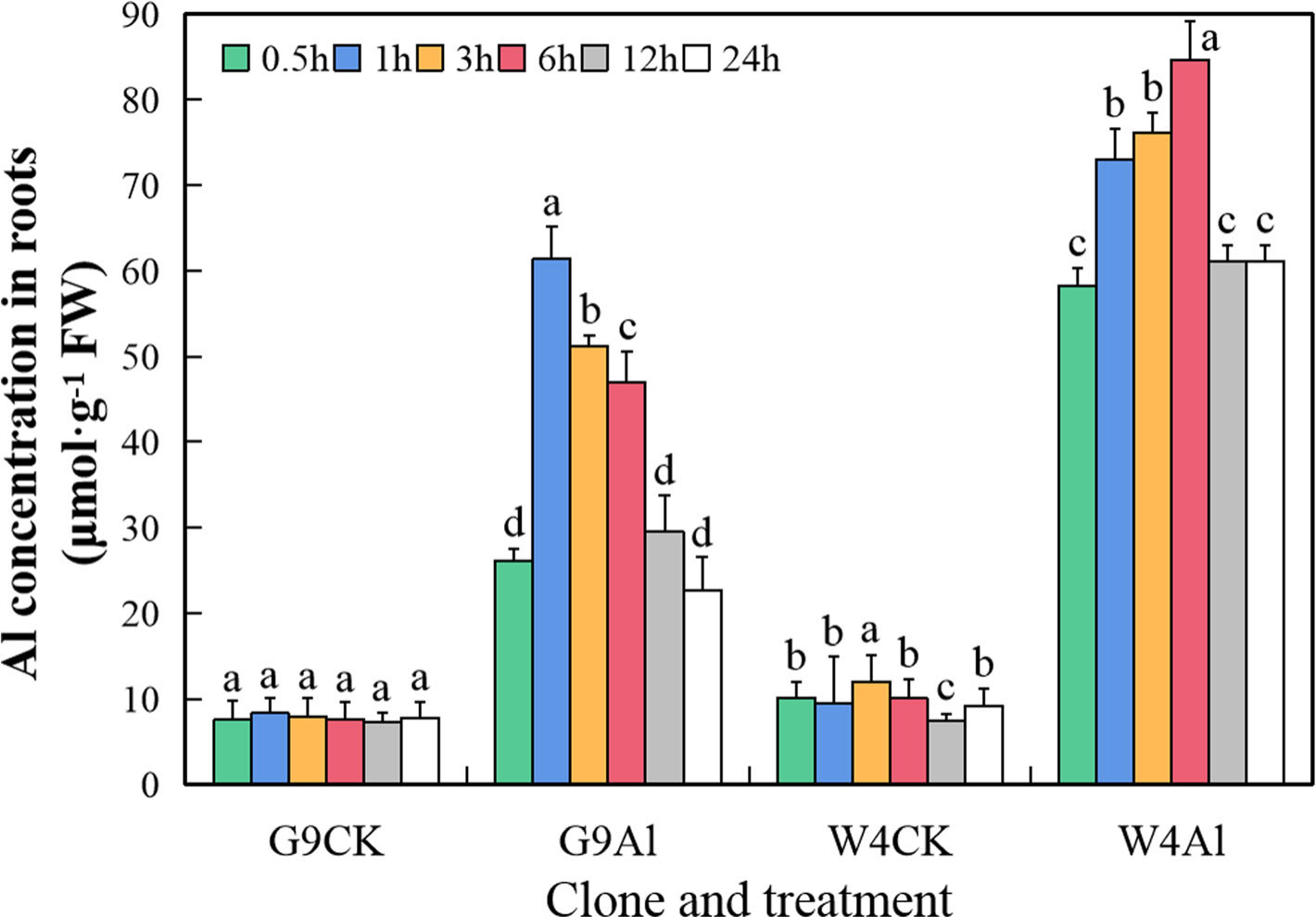 注:条形图表示平均值±标准误差(n = 3)。条形图上方的不同字母表示在P< 0.05水平上有显著差异。CK,非铝处理对照;Al,铝处理。